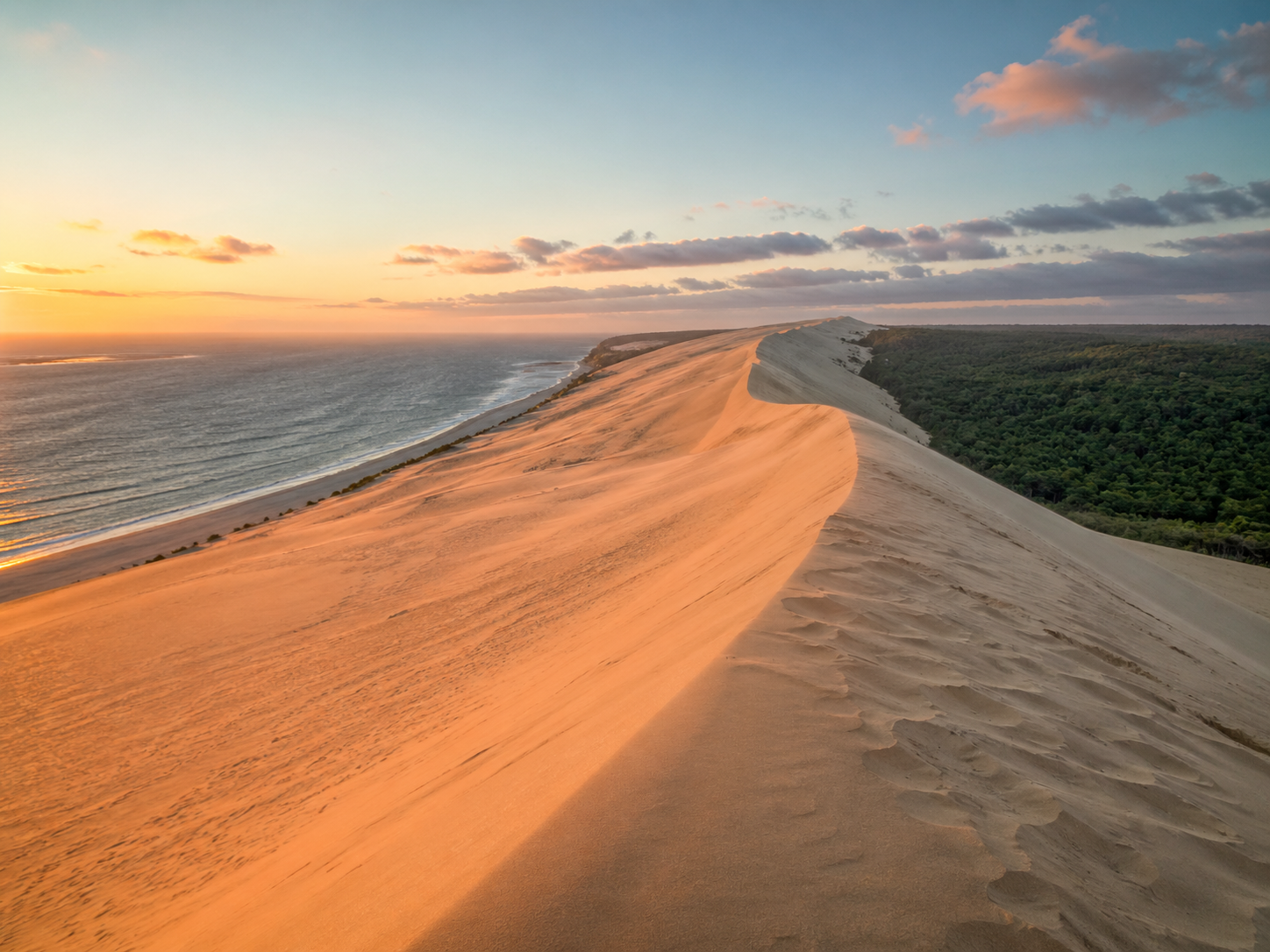 La dune du Pilat offre l’un des paysages les plus spectaculaires de Gironde, et même de France. Avec son contraste entre le sable, la forêt et l’océan, elle crée un décor très fort, avec un rendu souvent épuré, lumineux et presque cinématographique, surtout au lever ou au coucher du soleil.
